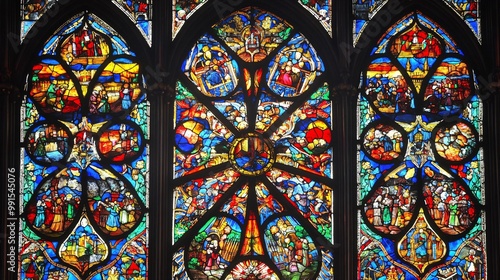 Fototapeta premium Colorful stained glass window with intricate designs and scenes.