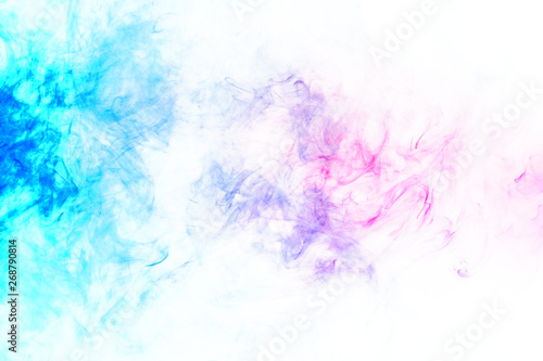 Fototapeta premium Colorful steam exhaled from the vape with a smooth transition of color molecules from turquoise to blue on a white background like a collision of two jets of smoke. Malicious virus and drug injection.