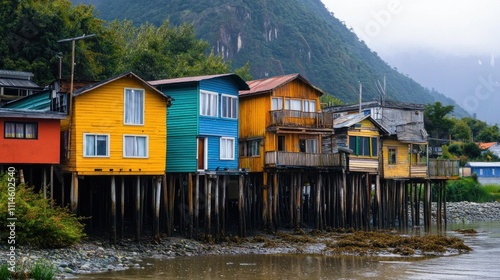 Naklejka premium Colorful Stilt Houses on a Misty Day