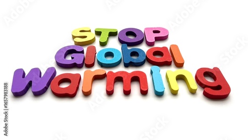 © Al-Jabbar99, Naklejka premium Colorful "STOP Global Warming" message using wooden letters.
