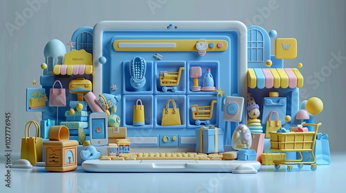 © Creativehub, Fototapeta premium Colorful Storefront with Pink and Blue Awnings and Sign
