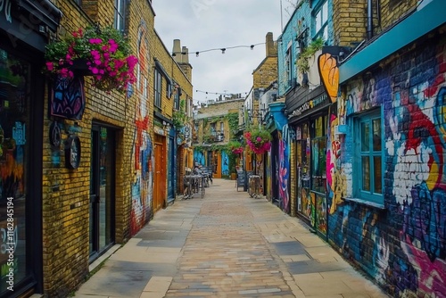 Fototapeta premium Colorful street art adorns a narrow, brick alleyway with vibrant shops and...