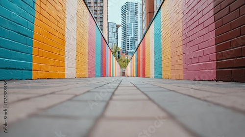 © kazitafahnizeer, Naklejka premium Colorful street art perspective showcasing vibrant murals in an urban alley with clear, wide space for copy text Urban Mural Vibes Colorful Alley Art Vibrant Street Showcase