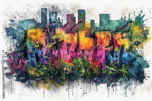Naklejka premium Colorful street graffiti art with urban backdrop and vibrant splashes of paint.