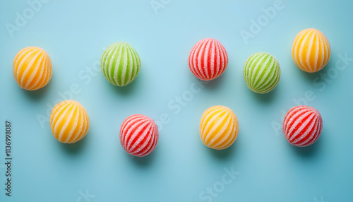 © Putu, Fototapeta premium Colorful striped candies arranged on a pastel blue background. Perfect for projects needing a sweet, vibrant, and playful aesthetic.