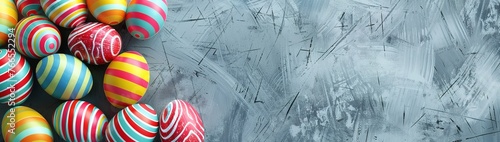 Obraz premium Colorful striped Easter eggs background banner with copy space, gray wall...