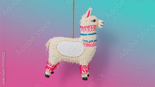 © Lasvu, Obraz premium Colorful stuffed llama hanging from a string with a gradient pink and blue background.