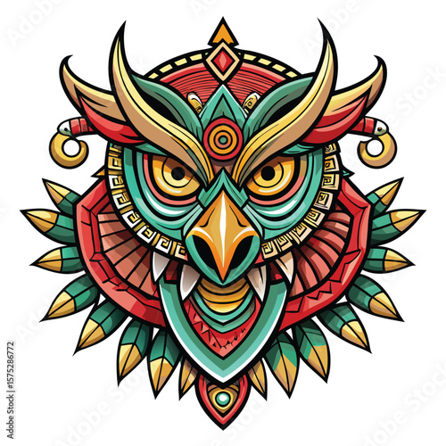 Fototapeta premium Colorful stylized owl head, adorned with intricate geometric patterns and vibrant colors, suggesting a tribal or indigenous aesthetic