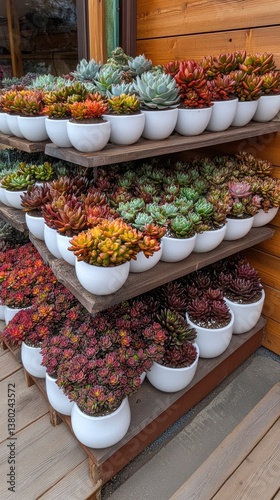 Fototapeta premium Colorful succulents arranged in white pots captivate visitors looking for...