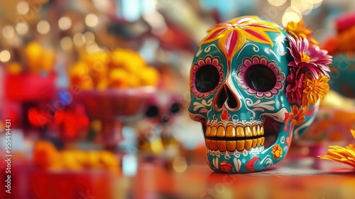 Fototapeta premium Colorful sugar skull decorated with flowers, symbolizing the Day of the Dead...