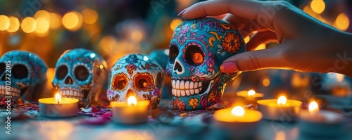 Fototapeta premium Colorful sugar skull with candles, symbolizing Dia de los Muertos, capturing...