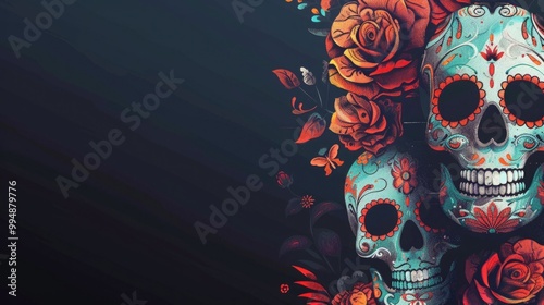 © Svetlana, Obraz premium Colorful sugar skulls surrounded by vibrant flowers on a dark background.