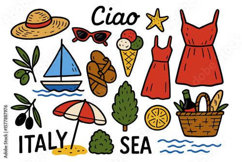 Naklejka premium Colorful summer elements from Italy celebrating sea, sunshine, and leisure...