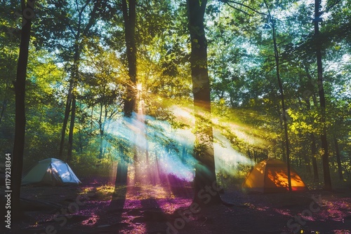 Fototapeta premium Colorful sunbeams illuminate forest campsite with tents among lush greenery.