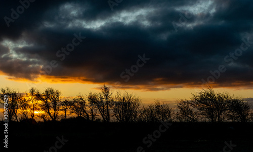 © ANDA, Obraz premium colorful sunrise on a windy morning with black tree silhouettes in the center of the picture
