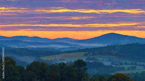 © Rafanudin, Fototapeta premium Colorful Sunrise Over Misty Mountains