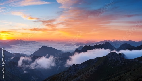 Obraz premium Colorful Sunrise Over Mountains With White Smoke And Cloud Formations In The...