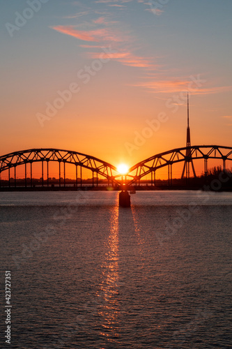 Naklejka premium Colorful sunrise over the Daugava river and the Railway bridge with the...