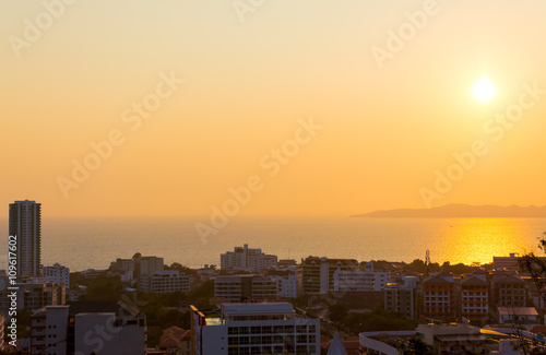 Fototapeta premium Colorful sunset at Pattaya bay, Thailand from above