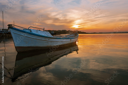 © Pamela, Naklejka premium Colorful sunset at the ocean with specular reflection with fisherman boat