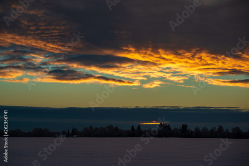 © Martins Vanags, Fototapeta premium colorful sunset light over fields of snow in winter
