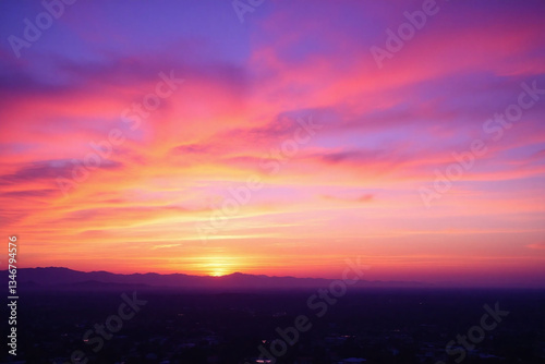 © AuraBloom, Obraz premium colorful sunset over a city with mountains in the background