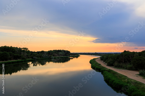 © were, Fototapeta premium Colorful sunset over the water of the Canal du Rhone near Aigues-Mortes in Carmarque