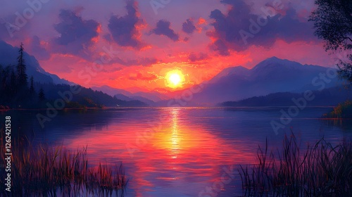 © Hanna, Fototapeta premium Colorful Sunset Over Tranquil Lake Surrounded by Majestic Mountain Peaks
