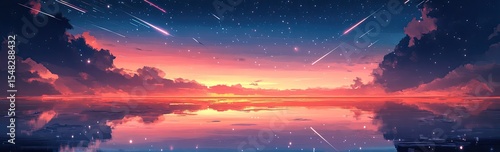 © Dewi, Fototapeta premium Colorful sunset over water with shooting stars