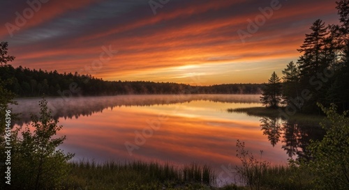 © Lemdah, Obraz premium Colorful sunset reflects in calm lake surrounded by dark forest edge