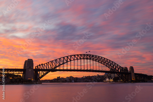 Naklejka premium Colorful sunset sky over Sydney Harbour Bridge.