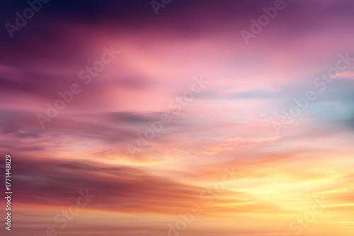 Fototapeta premium Colorful sunset sky with clouds defocused atmosphere, faceless evening beauty, natural visualization detail, blurred horizon background, divine creation concept, heavenly interface