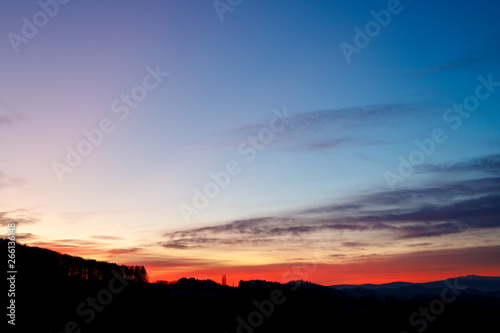 © woitzel, Fototapeta premium colorful sunset with glowing clouds and a tree a hill and valley silhouette in the austrian alps