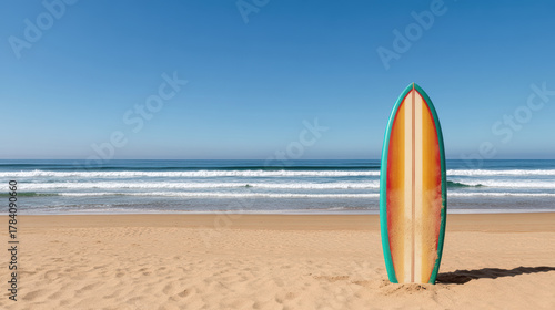 Fototapeta premium Colorful surfboard beach ocean waves sunny sky standing upright with shadow
