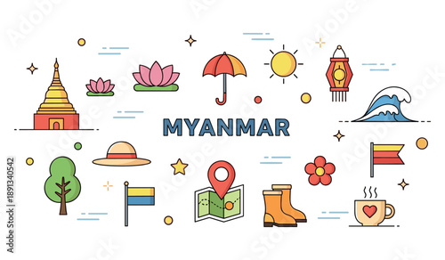 © supplement, Fototapeta premium Colorful symbols and landmarks of myanmar in flat design style