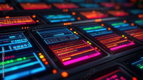 © AtomMaya, Obraz premium Colorful Technology Interface with Neon Light Display Background