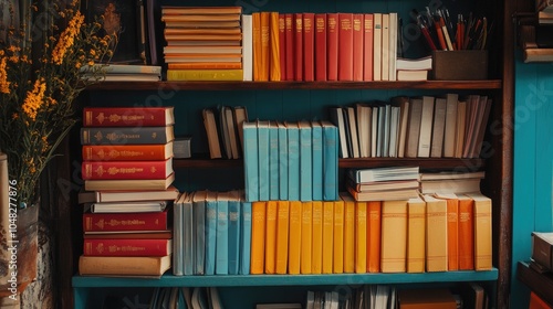 Fototapeta premium Colorful textbooks and organized stationery on a tidy shelf, ideal for promoting educational resources and study spaces