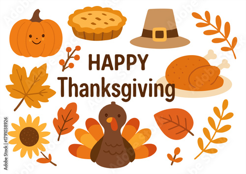 © Michailas, Fototapeta premium Colorful Thanksgiving illustration with pumpkin, turkey, pie, hat, leaves, sunflower, and berries in warm autumnal tones and playful designs