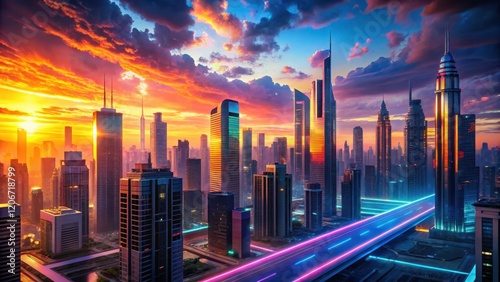 © udomsak, Fototapeta premium Colorful title overlay on a futuristic cityscape at sunset, urban landscape, sunset