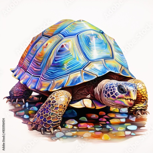 © Studicon, Naklejka premium Colorful tortoise with a vibrant shell stands on a rocky surface