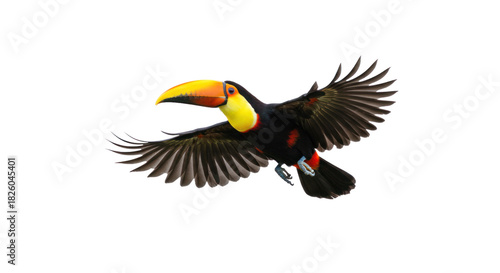 Obraz premium Colorful Toucan Bird Flying with Spread Wings and Vibrant Beak on Black...