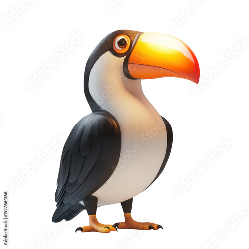 © PD, Naklejka premium Colorful toucan figurine standing on a white surface with vibrant features and a large orange beak