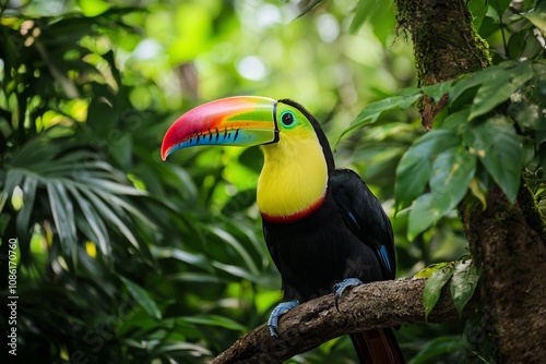 © Adi, Naklejka premium Colorful Toucan Perched Amid Lush Tropical Foliage