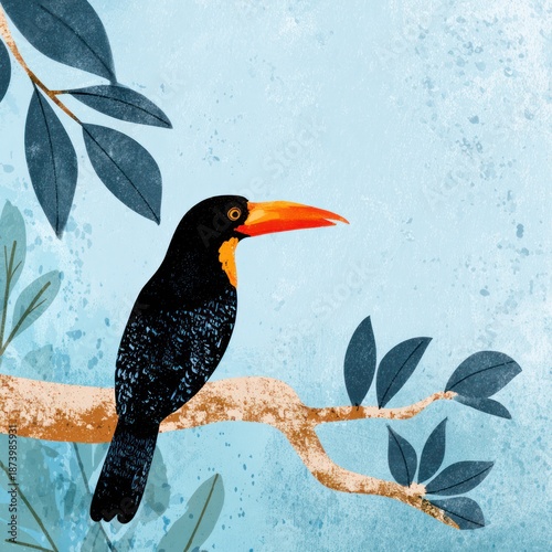 © LyceeChee, Fototapeta premium Colorful toucan perched on a branch against a blue sky