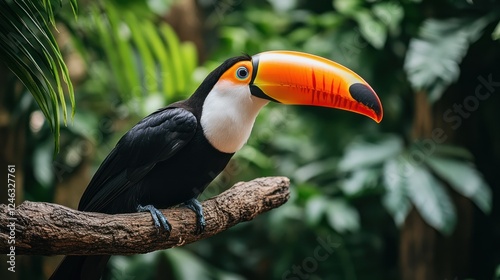 Naklejka premium Colorful toucan perched on a branch in lush rainforest.
