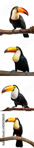 © tohceenilas, Fototapeta premium Colorful toucan perched on a branch, showcasing its vibrant beak and plumage, isolated on a white background.