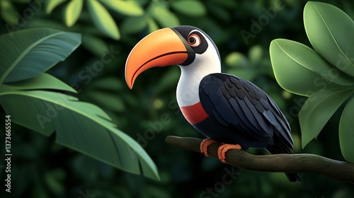 © Tam, Naklejka premium Colorful Toucan Perched on a Branch Surrounded by Green Foliage