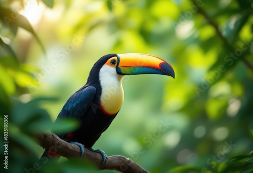 © Sergei, Naklejka premium Colorful toucan perched on branch in lush tropical forest