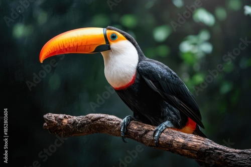 © Thanapong, Fototapeta premium Colorful toucan perched on tree branch with vibrant orange beak and striking black and white feathers in natural green forest background