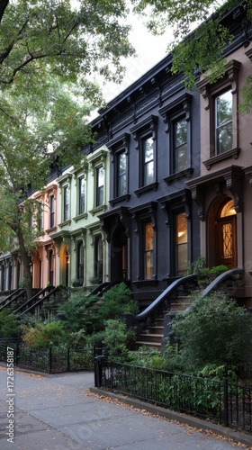 © Amphon, Fototapeta premium Colorful Townhouses on Tree Lined Street, Soft Lighting